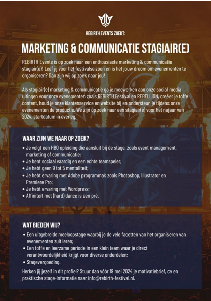 Dit semester wil ik de focus leggen op leerdoelen die nuttig zijn voor mijn stage van jaar 3. Ik wil zelf richting de festival branche met mijn stage en dan specifiek harddance. Hiervoor heb ik een voorbeeld vacature gevonden van Rebirth met daarin vereisten/kennis die ik moet beheersen.