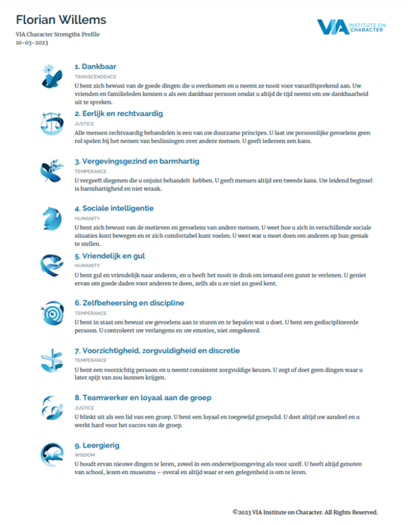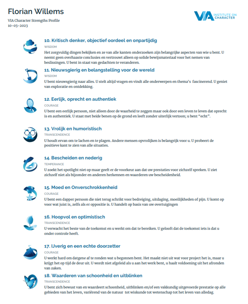 Hieronder vind je mijn resultaten van de VIA survey en de reflectie hierop.